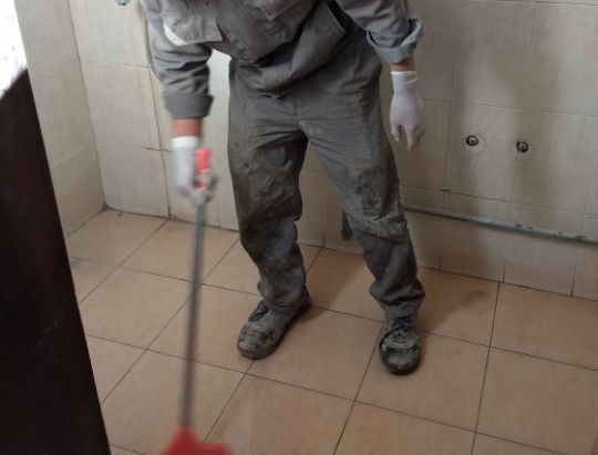 注:免敲砖防水材料一旦兑好,且倒在地上就必须用扫把来回不停扫动,否则会在短时间凝固在地砖上不好清理,待砖缝完全渗满即可停止渗透,此时迅速接一桶水将砖缝内的材料完全冲洗干净,并用抹布将地面的水斩干。