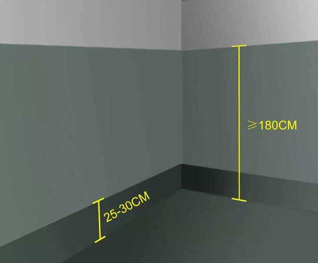 卫生间条件允许的情况下最好做干湿分离,淋浴区防水建议涂刷高度为180cm,其他干区防水建议涂刷高度为25-30cm,有朋友可能会觉得防水刷得越高越好,其实不然,防水高度只要满足生活需求就足够,一般都在2米以内,防水刷高了会影响后续瓷砖的铺贴,此外,刷防水涂料时不能留有死角,最好做成弧形。