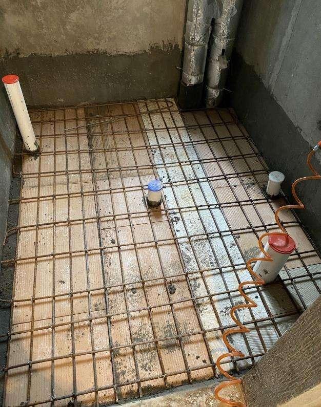 防水检验合格后,在铺贴瓷砖之前最好做一层防水保护层。用水泥、沙、陶粒按比例混合(水泥1:沙3:陶粒8)进行回填,然后用钢丝做加固处理,减轻沉池重量,回填时可以顺带给二次排水管放坡,不仅如此,回填还能避免防水层在施工时受到踩踏破坏。