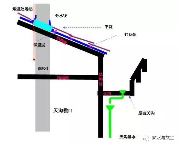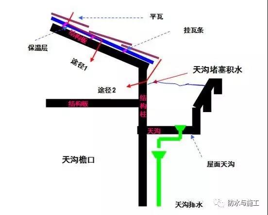 2)屋面天沟堵塞造成天沟积水而漫过防水层后进入户内。
