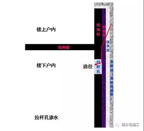 处理方法一:原因分析:拉杆孔封堵和外墙面砖缝不密实,雨水经过面砖缝进入内部,然后经过抹灰、保温层后从拉杆孔进入。