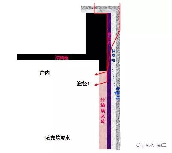 处理方法:原因分析:外墙或屋顶女儿墙砖缝(涂料)不密实,导致雨水渗入至外墙保温层或抹灰层内,最后从填充砖墙进入。