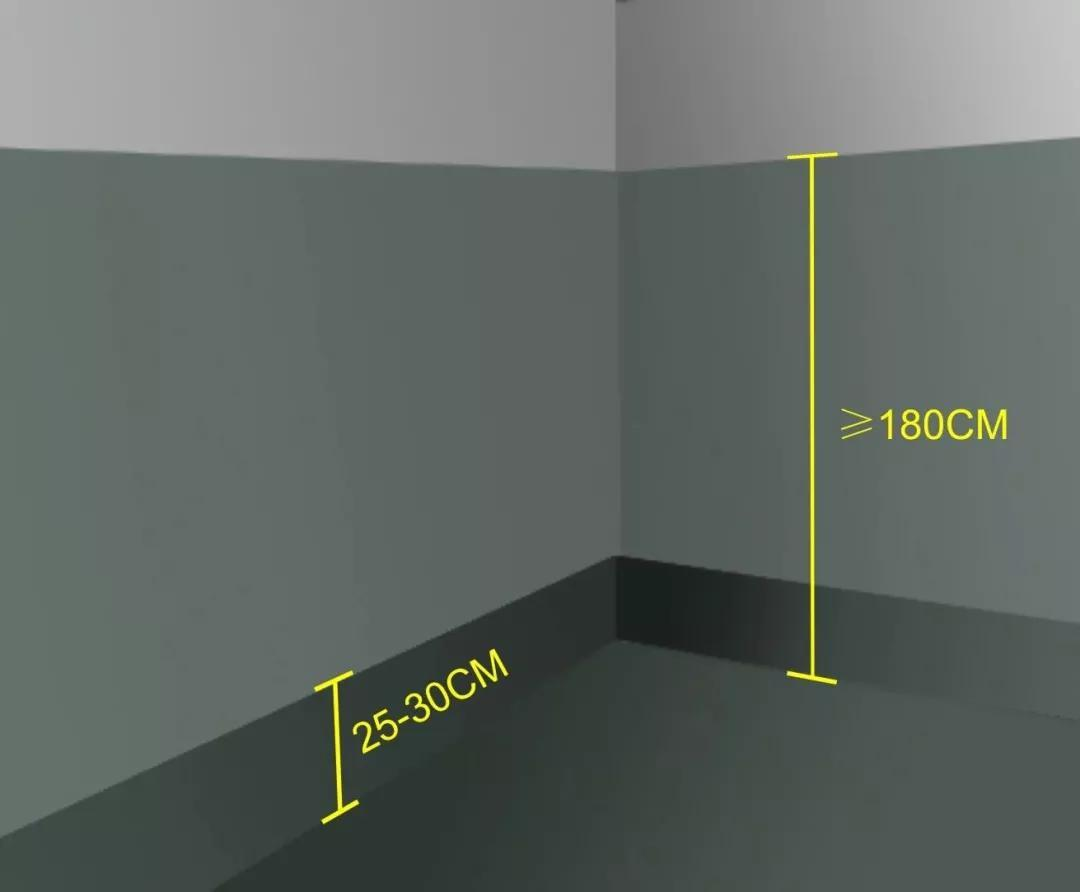 厨房墙面防水要做30厘米,如果有洗衣机和洗手盆的话可以把防水高度增加至1.2米,卫生间防水还是把整个墙面都做比较好,就算不做到顶也得保证在1.8米以上的高度。