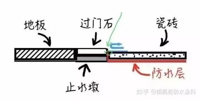 厨卫阳台与其他空间之间一般用门槛石分开,然后用朗凯奇堵漏王对门槛石和止水墩之间、以及过门石和门洞之间的缝隙进行填充,堵漏王干固后开始刷防水,防水要刷到门槛石和止水墩的交界线以上。如下图(重点看绿色圈的范围):