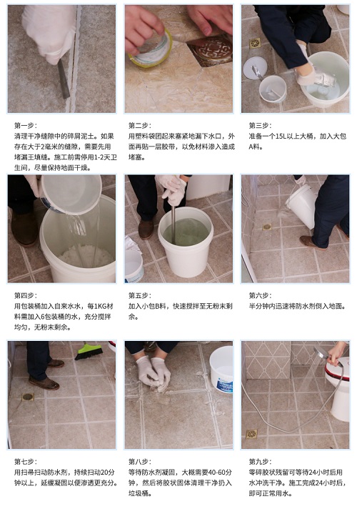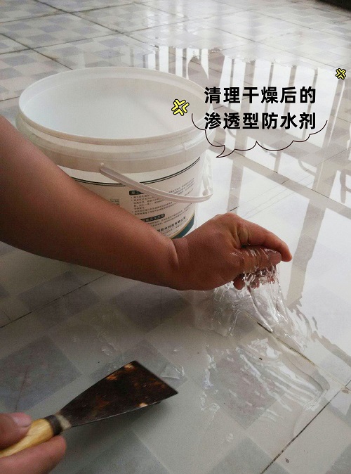 但说起来简单做起来难:倒渗透型防水剂之前,需要把整个地面都清理干净,特别是瓷砖缝里的泥,防止防水剂干燥后产生粘连。