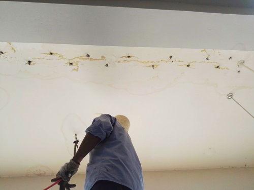 实际施工超级复杂,需要先到楼下天花板上去观察,确定漏水的位置,以及水流的走势(通过漏水痕迹判断)。再用专业工具一点点打孔,然后缓慢注浆。