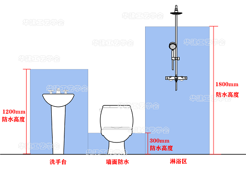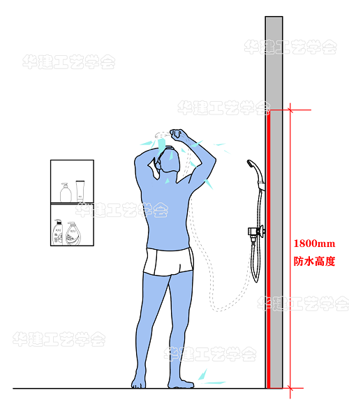 2、淋浴区防水高度为1800mm,主要考虑人员洗澡过程中水滴会溅到相应的高度。