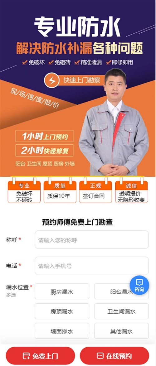 极目新闻记者在网络上输入“防水补漏”,网页上随即显示出了多条关联广告。记者随即点开了一条广告链接,页面弹出了一个简易的表格,并提示记者填写姓名和联系方式,稍后会有专业的师傅与记者取得联系。