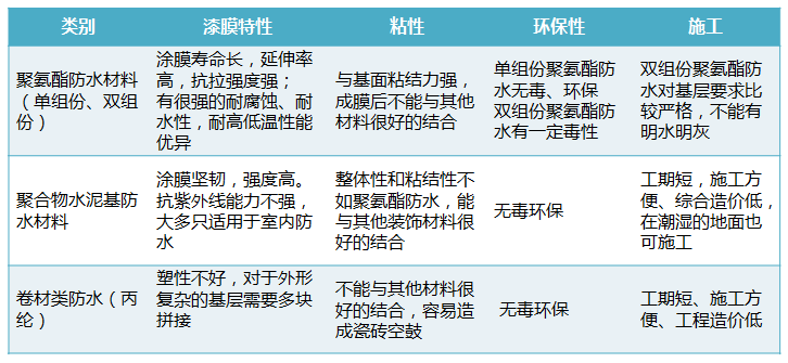 家装市场上销售的防水材料大致可以分为三类,聚氨酯防水材料(单组份、双组份)、聚合物水泥基防水材料以及卷材类防水(丙纶),其中聚合物水泥基使用比较广泛,已经逐渐成为防水涂料市场的主角。