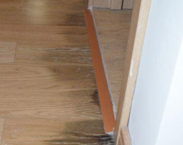 情况三、闭水试验没有问题,门泡了,卫生间门口板发黑。