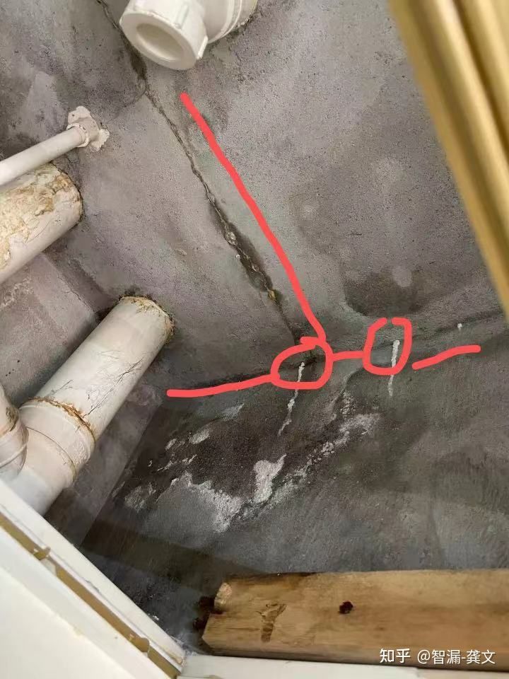 这是典型的防水问题。大致的问题是,楼板有一条裂缝和阴角缝漏水,见下图: