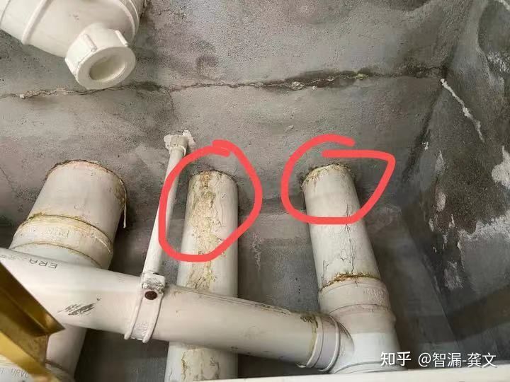 这是典型的防水问题。大致的问题是,楼板有一条裂缝和阴角缝漏水,见下图:一条裂缝,一条阴角缝漏水看图片,至少有两根管管口是有漏水的,见下图:红圈内管口漏水但你说,只有左边红圈内的水管摸上去是湿的,右边是..