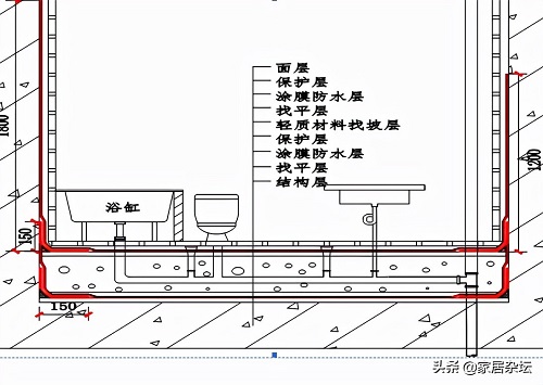 ①、所谓结构板上的卫生间防水,就是我们楼房主体施工完成以后的防水。这里包含了二次结构的施工完成,也就是说卫生间所有的墙体砌筑完成,抹灰完成,但是地面上的二次混凝土,也就是回填层并没有施工。这时一般是来布置地面上的水管,还有就是暖气管道。在楼房内的结构板上来布置室内的自来水管道以及暖气管道以后就需要重新浇筑混凝土,此时就需要在卫生间的结构板上来做防水。这就是卫生间的第一层防水。