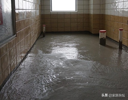 ②、卫生间的第一层防水施工完成以后,当防水涂料完全凝固,这时需要做第一次闭水试验。做法就是向卫生间的地面灌满水,然后蓄水72个小时来观察有没有渗漏。如果有渗漏,把水清干净,重新做防水,直到闭水试验合格。闭水实验合格以后才是我们室内的后浇层的混凝土的施工。也就说。这时在室内再打一层混凝土,这层混凝土的厚度,一般是六公分左右。这层混凝土就是后期我们毛坯房交房时所见到的地面。