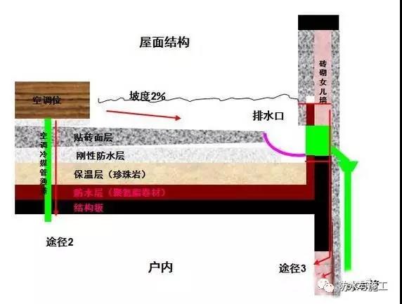 2)屋面天沟堵塞造成天沟积水而漫过防水层后进入户内。