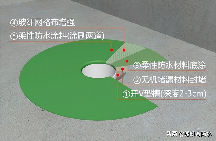 围绕管口周围进行开槽,深度及宽度以开至结构层为准,即PVC管四周无松动砂浆层,最后将开槽部分用密封胶、止水条或与密封胶有相同功能的密封材料进行密封防水处理。