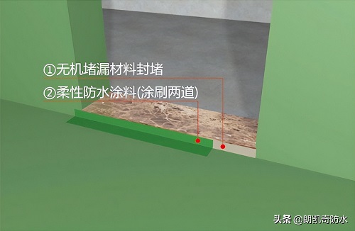防水层应翻过止水坎并向外延展,长度不宜小于500mm,两侧宽度不宜小于200mm。如果已经先安装好了门槛石,应将防水层反复涂刷在门槛石卫生间侧立面。