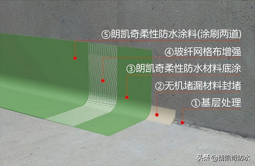 在阴阳角处采用“两涂一布”的防水施工工艺,在防水涂料施工中加入胎体增强材料。