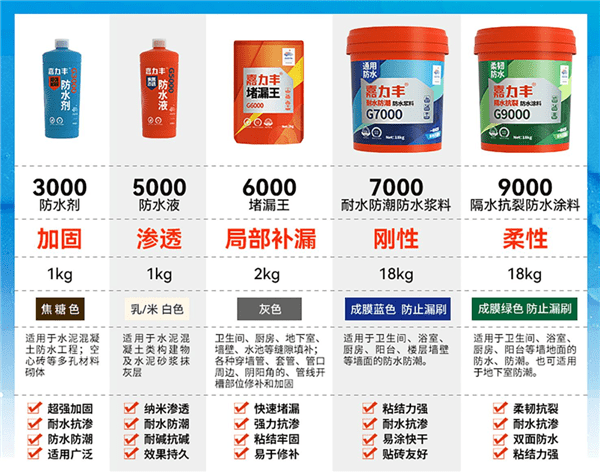 只有用对地方才能材尽其能、物尽其用,起到最佳的防水效果。用嘉力丰5款防水系列产品,多层防护,无惧渗水。