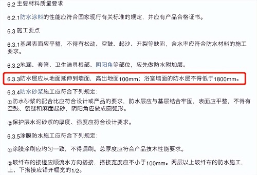 6.3.3 防水层应从地面延伸到墙面,高出地面100mm,浴室墙面的防水层不得低于1800mm。以免出现积水渗透墙面造成返潮和脱落的现象!