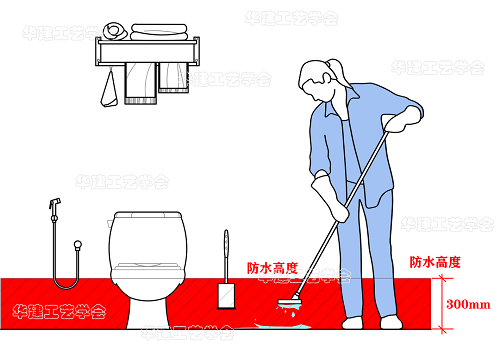 1、墙面防水为300mm防水高度,主要考虑到清洁卫生时会使用水进行冲刷墙角底部位置,而300mm以上高度是不会被冲洗的。