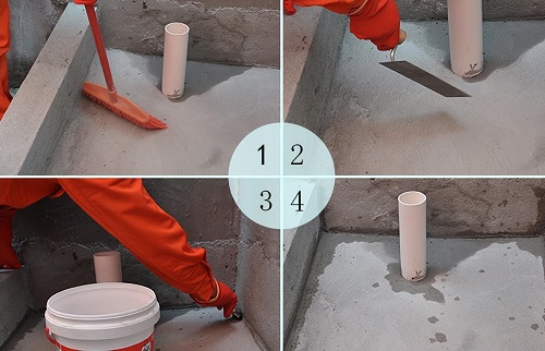 防水施工流程:基层处理→涂刷防水→闭水实验→做防水保护。